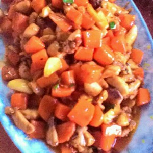 鸡肉切丁,胡萝卜切丁,姜蒜葱切好,酱油葱白调汁。