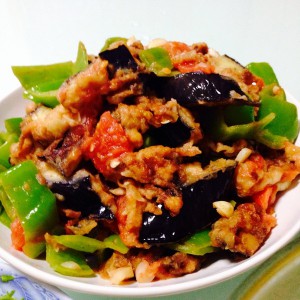 西红柿青椒切块入锅翻炒,待西红柿出汁,将炸好的茄块入锅快速翻炒并加入蒜末,和盐、花椒、孜然等佐料,快速出锅。