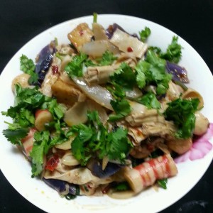 把焯好的菜倒锅里,翻炒一下,加调料调味,出锅前加白熟芝麻,出锅后加香菜!就OK了!