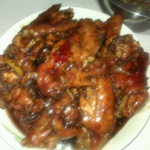 锅里放油,加入两个大料,几片姜把鸡翅倒锅里翻炒,炒干水份,(水一定要炒干,否则口感不好)