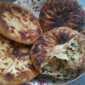 平底锅不太大,一次放三个馅饼。先把锅烧热再放入适量油,然后放入饼饼