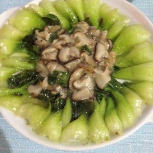 接着放入青菜,炒出青菜的水分,再放入香菇片,翻炒至香菇变软,青菜不要太软