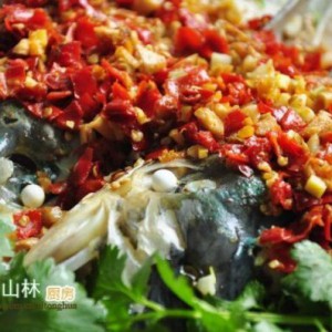 雄鱼头请鱼贩子清理好并在鱼头顶端剖一刀(不要剖到底),使鱼头可以拉开平摆在盘中。