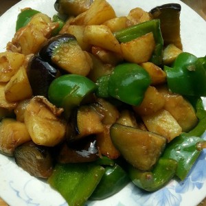 姜 蒜切片,葱切丝,用炸土豆剩下的油,烧到蒜发硬发黄,入太空椒,放一点醋,40秒盛出太空椒,入茄子翻炒至变软