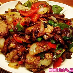 炒锅开小小火,放入相对比较肥的肉爆出油后,加所有的肉一起爆30秒