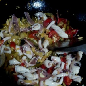 油热了之后先放泡椒 ,然后放入鱿鱼抄抄就行。