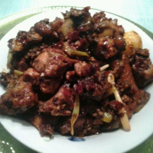烧10一15分钟后,鸡皮看到出油,有糯糯的感觉,放入蒜苗,炒两下,就可装盘