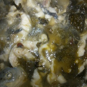 走起~~锅中入底油,加酸菜,煸炒三分钟到出香味后,加入开水。开锅后入鱼片。
