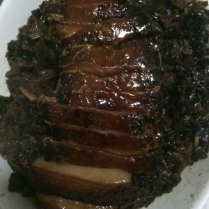 蒸好后,将汤汁倒入锅内,加水淀粉勾芡。五花肉扣至另一个盘中,勾好芡的汤汁倒在上边,香气四溢的梅菜扣肉出锅啦!