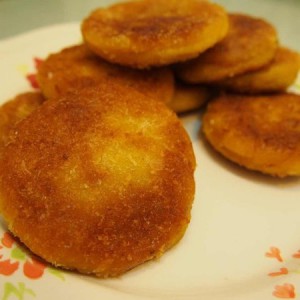 活好的面分成均匀面团 包入豆沙馅 压扁 粘上面包糠 由于用的是日本南瓜 所以是金色的 也不会很甜