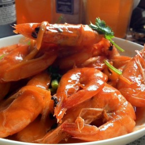 将汤汁淋在虾上