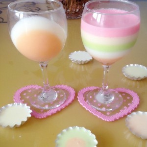 准备俩个玻璃器皿,可以淘宝购买布丁瓶,我用的是普通酒杯想要有斜款花纹的,可以把器皿斜置固定在一个碗里慢慢加入溶解好的QQ糖和牛奶液,然后冰箱冷冻10分钟左右按此方法以此加入各个颜色冷冻