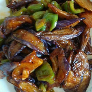 锅内入葱姜蒜青椒揙炒,倒入番茄酱,茄子