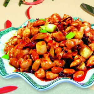 锅中倒少许油,油温不能太高,倒入鸡丁,变色后放入辣椒面和红辣椒段,翻炒几下,接着放碗汁 紧跟着赶快放葱段,这样炒会清香葱不会老,最后放花生米翻炒几下出锅