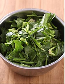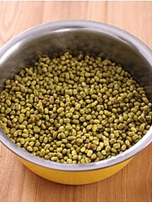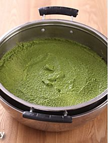 菠菜和绿豆一起用搅拌器打成粗浆。手摸上去会有沙沙的感觉,无需太细腻。