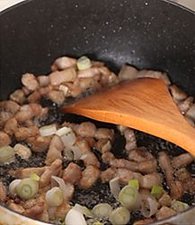 锅里热少许油,放入五花肉煎至出油,白肉部分发黄,放入葱姜翻炒一下