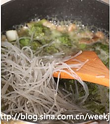 放入掰小块或者切小块的扒谷和粉条(粉条提前热水泡至7-8成软),边炒边把扒谷碾碎。