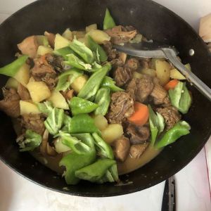 等到土豆也变色,加入青椒和胡萝卜,翻炒一下即可出锅