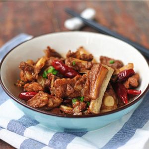 加入八角、桂皮、红辣椒炖煮至排骨可以轻松用筷子撮进去