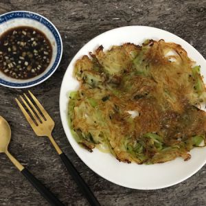 一瓣蒜切成蒜末,一点葱末,一勺生抽,一勺香醋,一小勺香油,就成了沾汁面!香脆的土豆煎饼配上微酸的酱汁很是爽口哦!