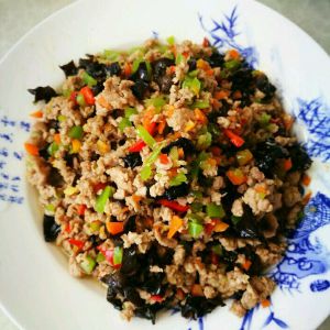 锅里放油预热以后把肉倒进锅里翻炒,火候可以根据自己家里的工具(如电磁炉)调节,翻炒以后把肉扒在一边,然后把切好青笋、黑木耳、胡萝卜、红椒、姜末放在锅里炒,翻炒的差不多以后把肉伴在一起炒,放上生抽,适量的盐炒出来就可以了!