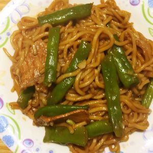 将肉炒熟,放入豆角,加入适量盐、生抽、老抽,加入水