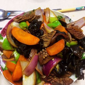 先炒胡萝卜和木耳,炒至锅萝卜变软