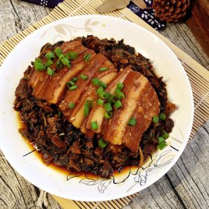 油锅中剩少许油,放入泡好的梅干菜,炒加料酒、生抽、白糖,翻炒至香气浓郁出锅备用。