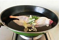 把鸭子洗干净,放入冷水锅中,放入葱、姜、盐、料酒、生抽、八角、桂皮大火煮至八成熟