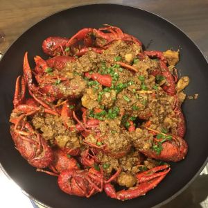 放入油加热后放入葱白,蒜油热至香味溢出后放入龙虾翻炒至身体发红,加生抽,加少许料酒和姜片去腥,撩出备用。多余的油放至另一锅,把咸蛋黄放入低温融化起沫。见上图二锅图片。