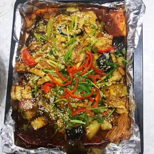 放完配菜烤两分钟左右,一道美味的烤鱼就完成了