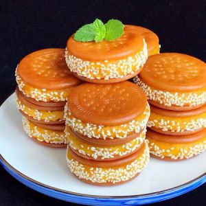 取一小块南瓜面团搓圆压扁方在一块早餐饼干上