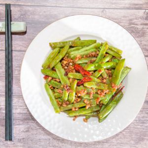 爆炒:加入四季豆,放入照烧汁和藤椒汁,大火爆炒至食材全部上色,关火出锅