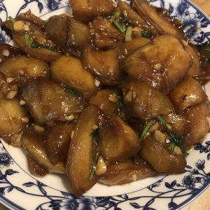 锅里倒油,下蒜末炒香,下茄子翻炒2分钟后倒入2勺生抽,半勺老抽,继续翻炒。