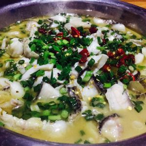 然后下腌制好的鱼片,大火,熟了马上起锅,盛到刚才放酸菜和鱼骨的那个盘里。