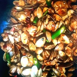 起锅热油,放入葱,姜,蒜蓉,豆瓣酱等炒出香味,放入花蛤