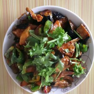接着放入炸好的茄子和土豆,翻炒几下,倒入水淀粉,锅滚后翻炒几下,关火。