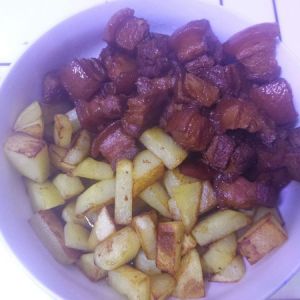 一边炖一边切土豆 切成你喜欢的样子 锅里烧油 这时的油就要多 土豆才不会黏在一起