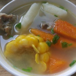 将排骨焯水捞起备用,胡萝卜玉米山药,切好备用。