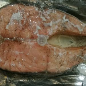 三文鱼正、反面均匀涂抹少量黑椒和食盐,包上锡纸入烤箱,220度烤15分钟即可