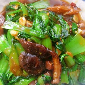 锅里倒油小火炒香蒜片红椒、倒入青菜香菇、调好的汁倒入锅中、大火收汁、完美起锅。