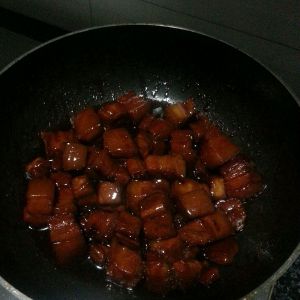 把糖色均匀的裹到肉块上,在加入适量的开水,水量根据你用的锅而定,用砂锅的话水在肉的三分之二,用不粘锅的话水量刚刚漫过肉,大火烧开转小火炖一个半小时