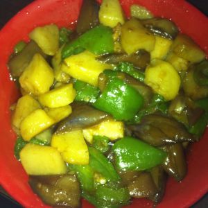 另起锅,锅内放油;把蒜末,葱放入爆香;把茄子、土豆、还有青椒放入翻炒;放酱油,味极鲜翻炒;放点糖、味精翻炒。再准备点水淀粉放入,翻炒会。放盐,翻炒入味;即可。