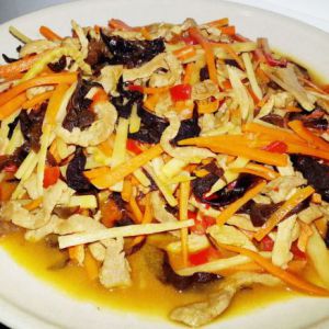 倒入笋丝、胡萝卜丝和黑木耳丝转大火翻炒一会儿,再倒入肉丝