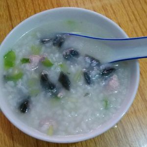 等米煮的有点微烂了,就可以把瘦肉皮蛋下锅了!再放盐巴味精鸡精调味!