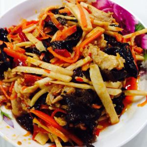 起油锅,先将姜片、大蒜爆香,随后放入肉丝翻炒,炒至肉丝渐白将胡萝卜、冬笋和木耳一起放入,加入两勺郫县豆瓣酱。炒熟、炒均匀,出锅,就大功告成了。