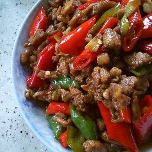 辣椒八成熟时放入鸡丁翻炒,放入少许白糖提鲜,出锅前放入鸡精