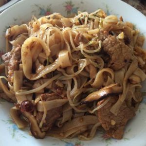 倒入河粉、牛肉,放老抽、盐调味,喜欢吃辣的可以加入豆豉酱、牛肉酱等