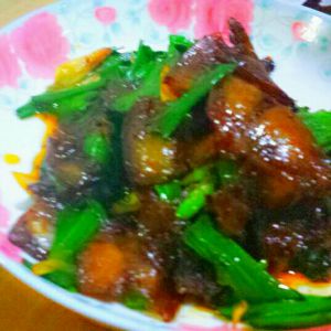 最后加入蒜苗即可,但是蒜苗根部先要倒入炒制一下再放叶子