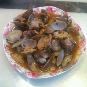 热锅热油煸香葱、姜、蒜、豆豉、辣椒油、花椒、干辣椒。倒入花蛤翻炒片刻,加少许酱油和适量的水。